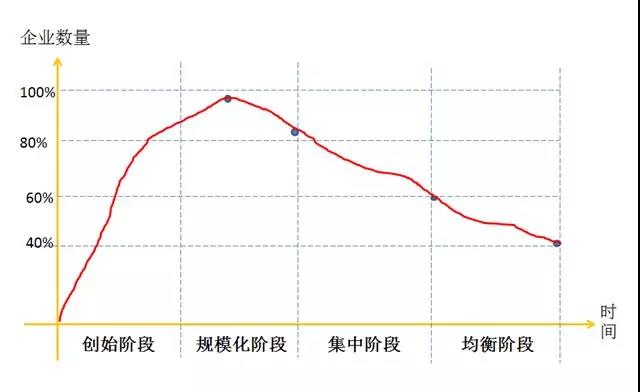 在一個行業(yè),從長期看,企業(yè)要存活下來就要有超出平均水平的成本控制能力。管理學家陳春花認為一個行業(yè)內(nèi)企業(yè)數(shù)量和時間軸之間的關(guān)系可以通過四個發(fā)展階段來說明:初創(chuàng)階段、規(guī)?;A段企業(yè)數(shù)量一直上升,規(guī)?;笃谄髽I(yè)數(shù)量達到頂峰,開始有擠出效應,約20%企業(yè)出局,到集中階段又有20%企業(yè)出局,到均衡階段還要淘汰20%,最后的競爭就在剩下的40%企業(yè)之間展開。